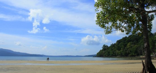 Lakshmanpur Beach-1 (Sunset Point) lies 2 kms north of the jetty and one can view a spectacular sunset from this secluded beach. This wide beach is filled with deep white sand that grabs your feet as you walk on it. Covered with lots of white shells and shallow water, it is best suited for snorkelling, sunbathing, swimming and other pleasure activities. The rocky beach with lots of coral formations, ornamental fish, sea urchins, sea cucumbers, star fish, etc. would be of great interest to tourists of scientific temperament. The rocky surface can get slippery and one needs to be always on one's guard. The best thing about this beach is that it is triangular and once you stand near the point, you can gaze on the deep horizon as far as the eyes can see.